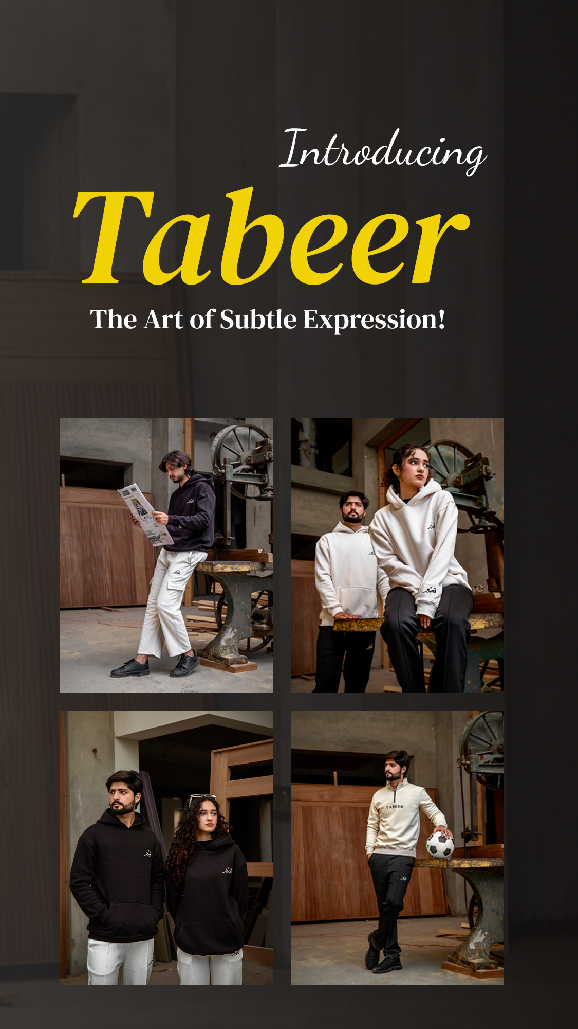 Born from a simple idea — to create clothing that speaks softly yet leaves an impression. What started as a small vision soon became تعبیر — a journey of turning everyday wear into meaningful expression. Each piece is designed with intention, blending culture, comfort, and modern minimalism to craft styles that feel as authentic as they look. Tabeer isn’t just fashion — it’s an emotion stitched into every thread.